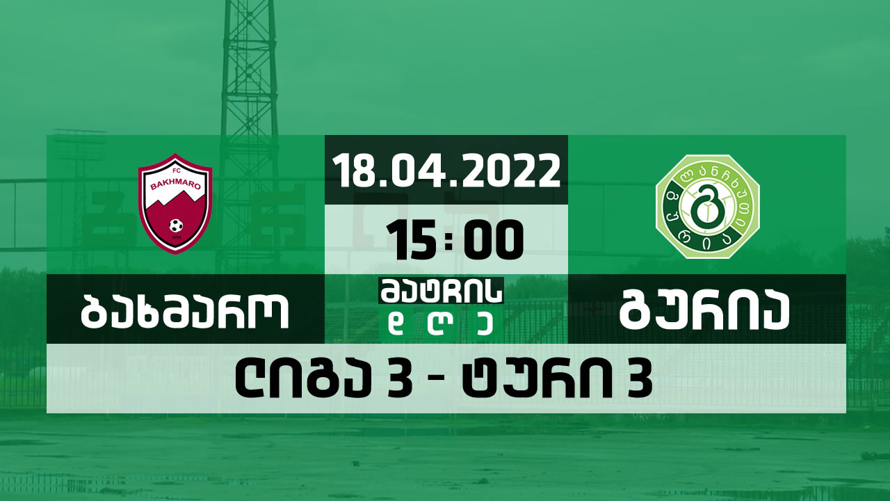 ლიგა 3-ის მესამე ტურის შეხვედრა გაიმართება ჩოხატაურში ბორის პაიჭაძის სახელობის სტადიონზე სადაც გურიას ბახმარო უმასპინძლებს მატჩი გაიმართება 18 აპრილს 15:00 საათზე.